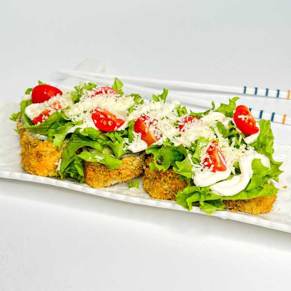 Ролл с оригинальной подачей. Рис, нори, творожный сыр, жареный цыпленок, свежий огурчик, кляр,оформляется сочным салатом/пекинской капустой, соусом Цезарь, сыром Пармезан, свежим помидорчиком